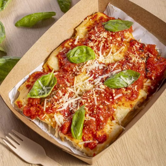 Camadas de berinjela grelhada, molho bechamel e pomodoro, queijo derretido e manjericão fresco.