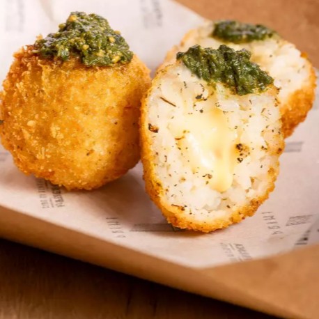 Bolinho de risoto frito, recheado com queijo derretido e crocância perfeita.