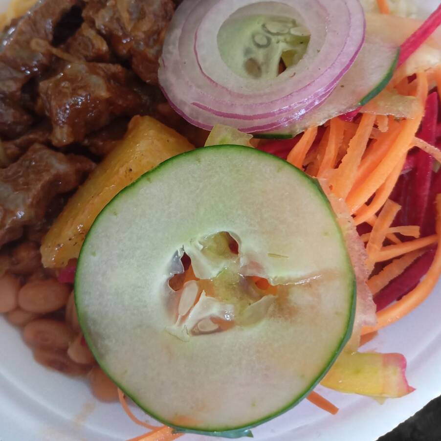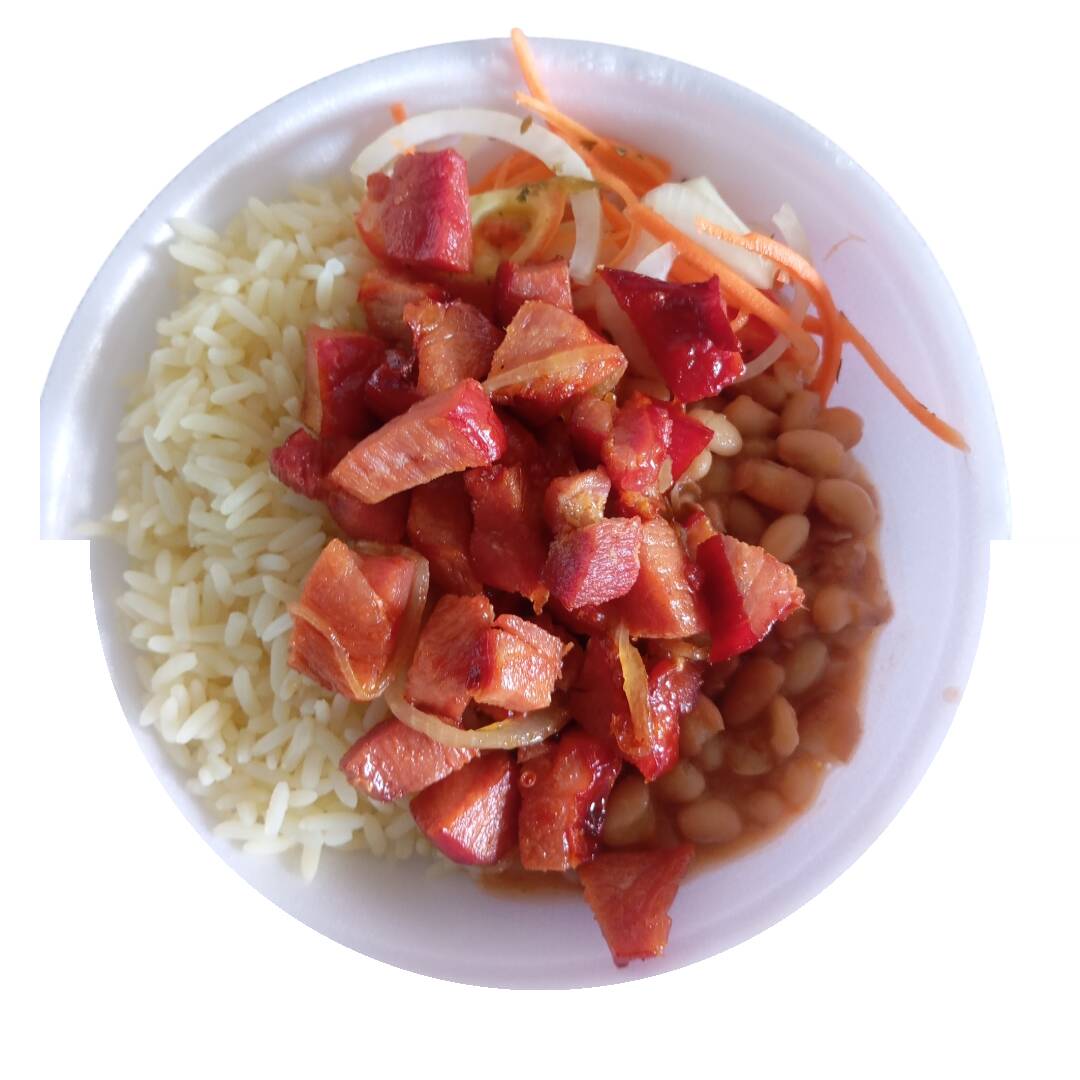 Carne de fumeiro acebolada, feijão tropeiro, arroz e salada
