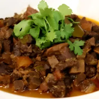 Sarapatel com arroz, farofa e molho de pimenta