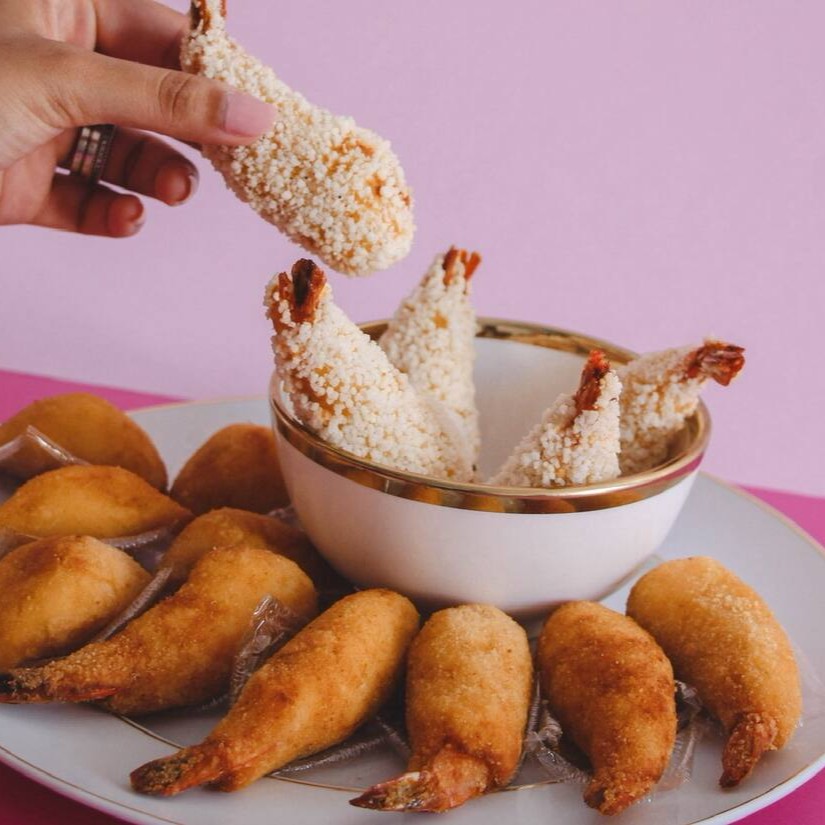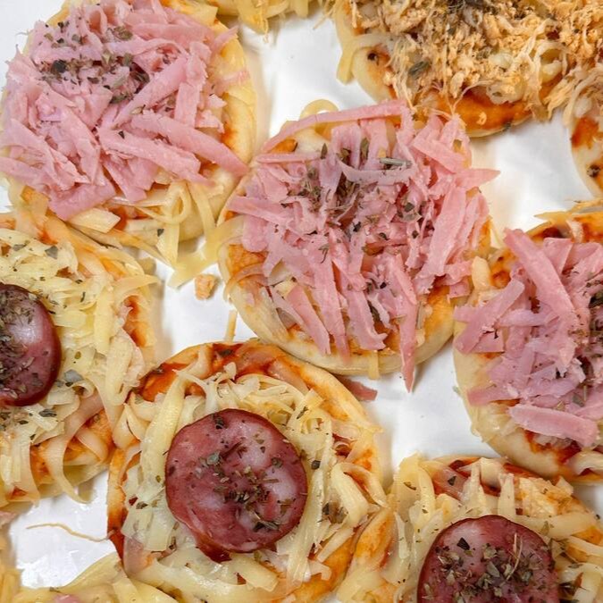 Caixa com 10 pãezinhos variados e 20 salgadinhos diversos: