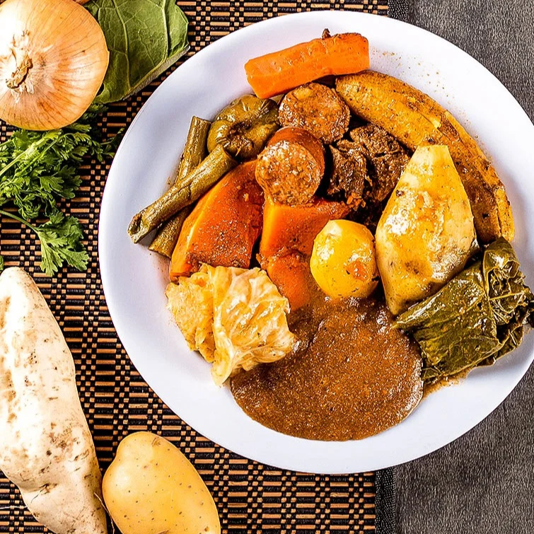 Cozido com carne de boi , acompanhado de pirão , arroz branco , verduras e legumes .