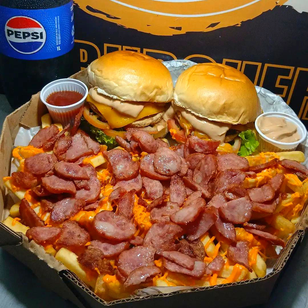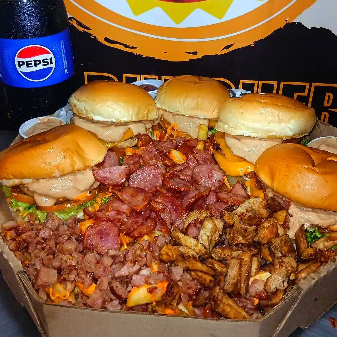 5 deliciosos x-burguer ao cheddar com molho especial,mas uma porçao de batata com cheddar,mas calabresa,frango grelhado na chapa e bacon,mas refrigerante litro.