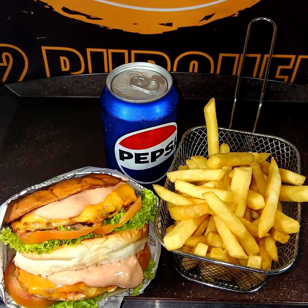 1 delicioso duplo x-burguer ao cheddar com molho especial da casa,mas uma porção crocante de batata de 250g,mas refrigerante lata