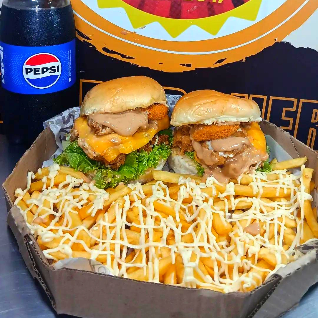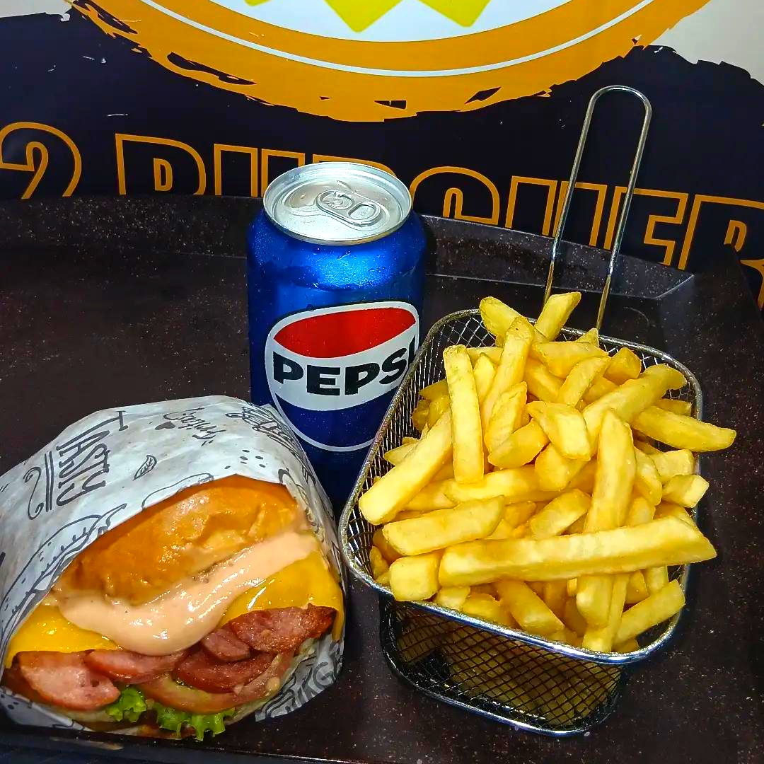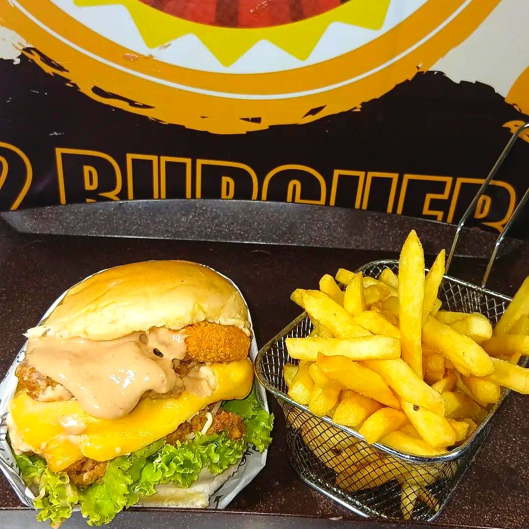 2 deliciosos x-burguer gourmet ao cheddar com molho especial da casa,mas 2 porçoes de batata de 250g