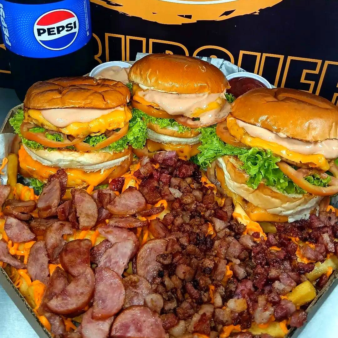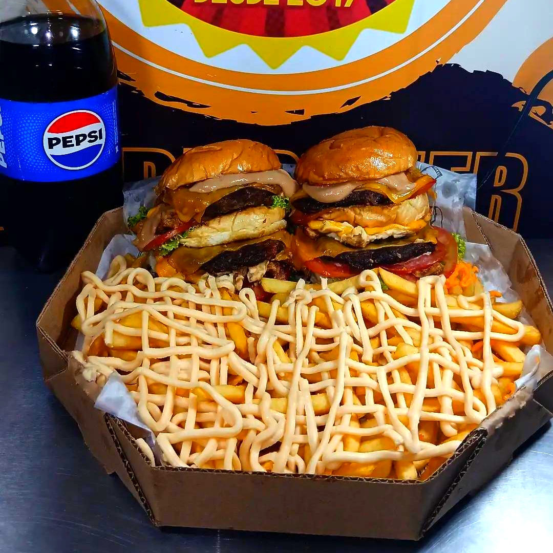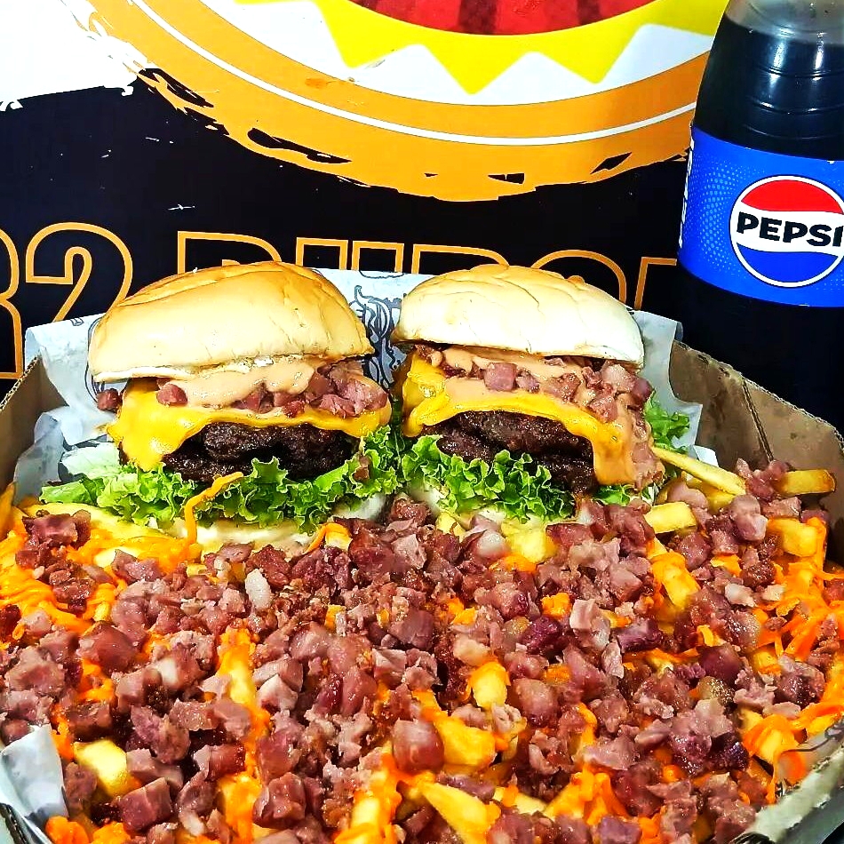 2 deliciosos x-burguer gourmet ao cheddar com molho especial da casa,mas 2 porçoes de batata de 250g
