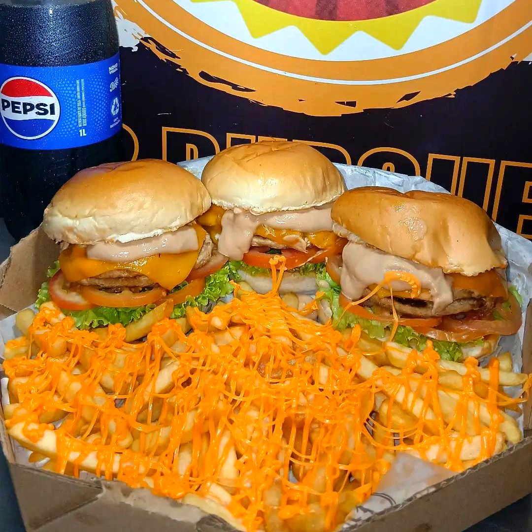 3 deliciosos x-burguer ao cheddar com molho especial da casa,mas uma porçao de batata com cheddar,mas refrigerante litro