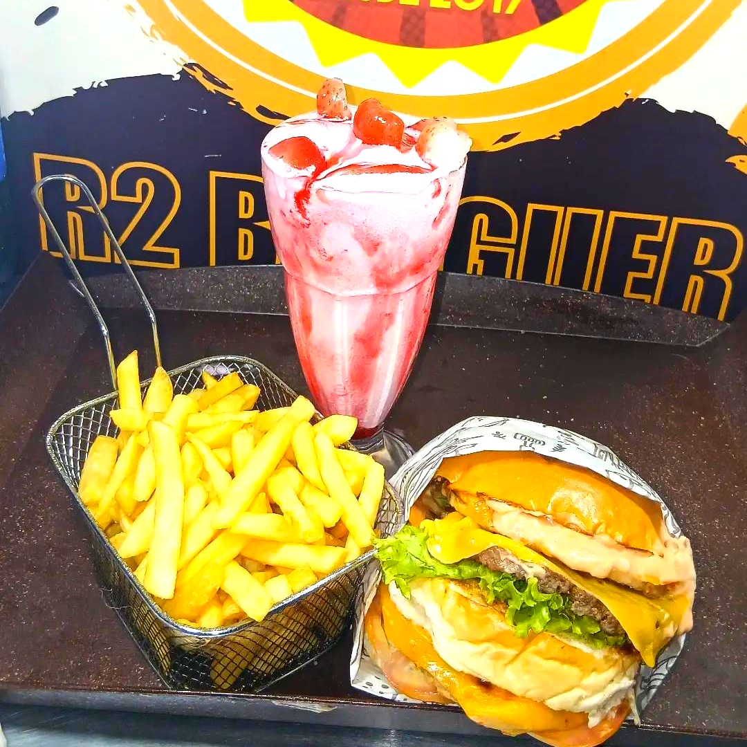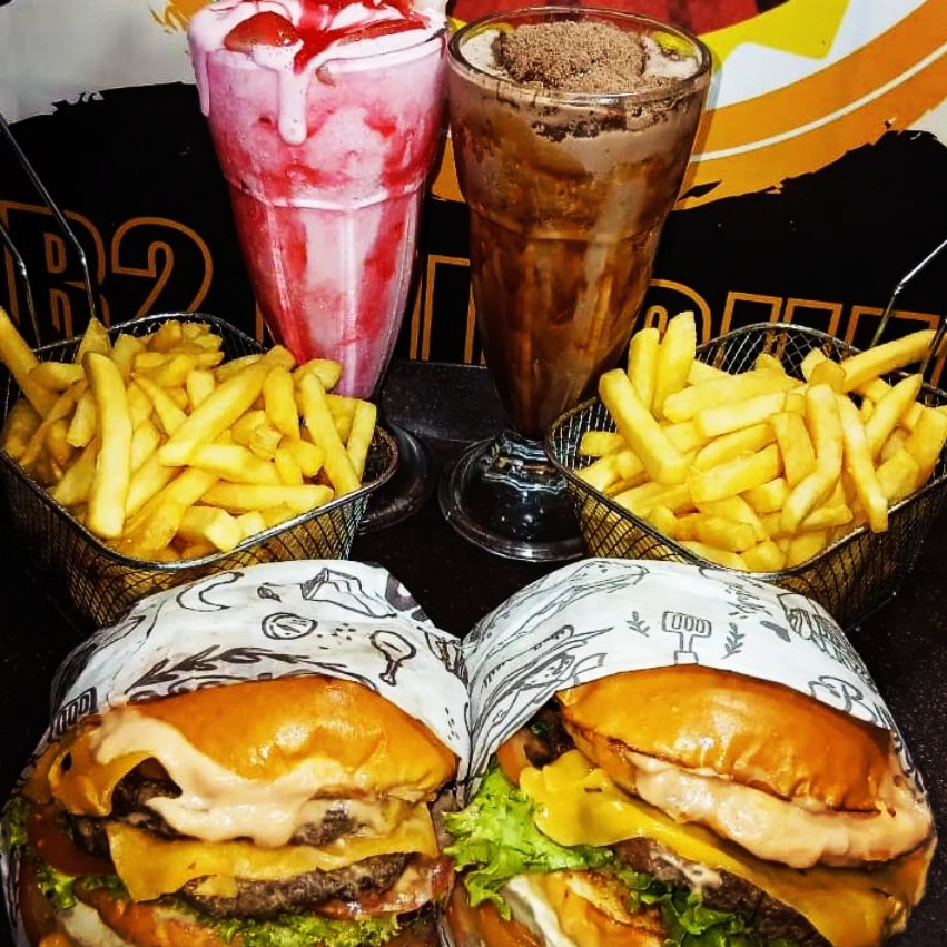 2 duplo x-burguer ao cheddar com delicioso molho especial da casa,mas 2 porçoes de batatata de 250g cada,com 2 deliciosos milshek de 500ml