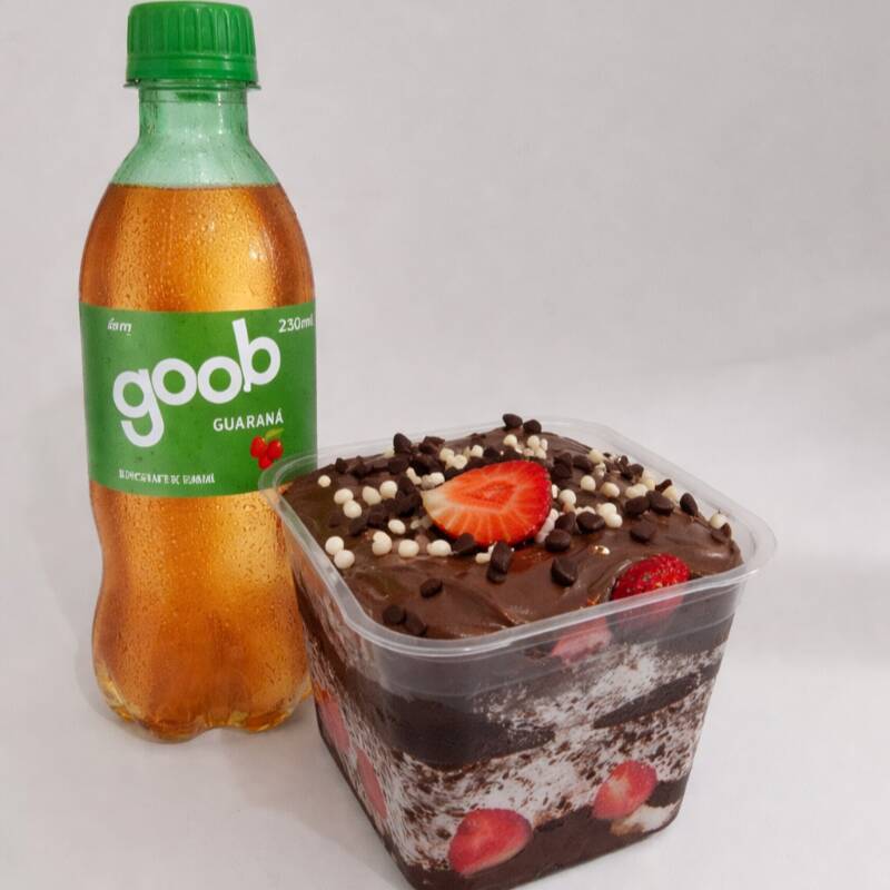 Bolo de pote bem recheado com guaraná bem gelado, por um precinho