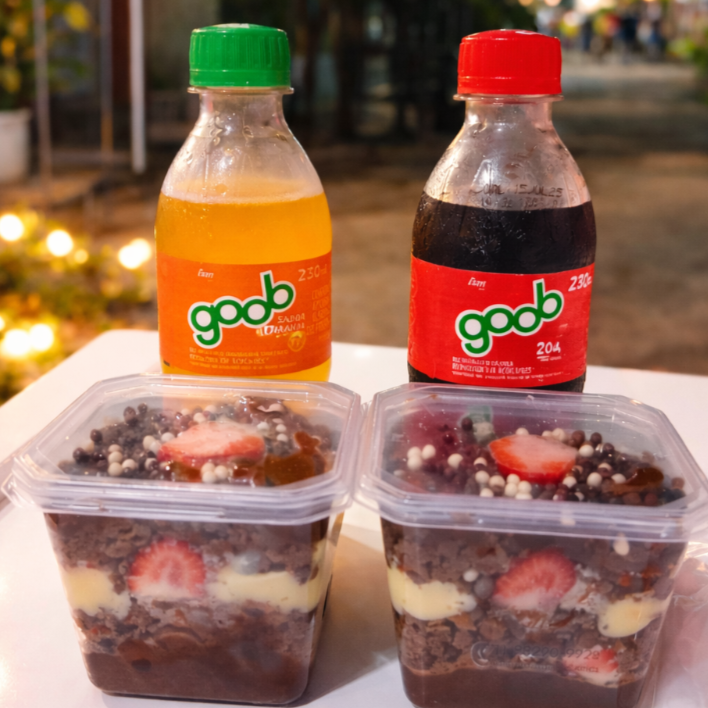 Dois bolos de pote de sua preferência e dois refrigerantes de sua preferência de 230ml
