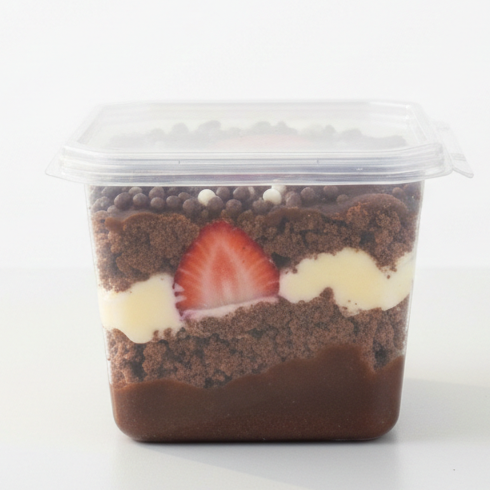 Massa de chocolate, recheio de brigadeiro pedaços de morango ou Bombom e choco ball