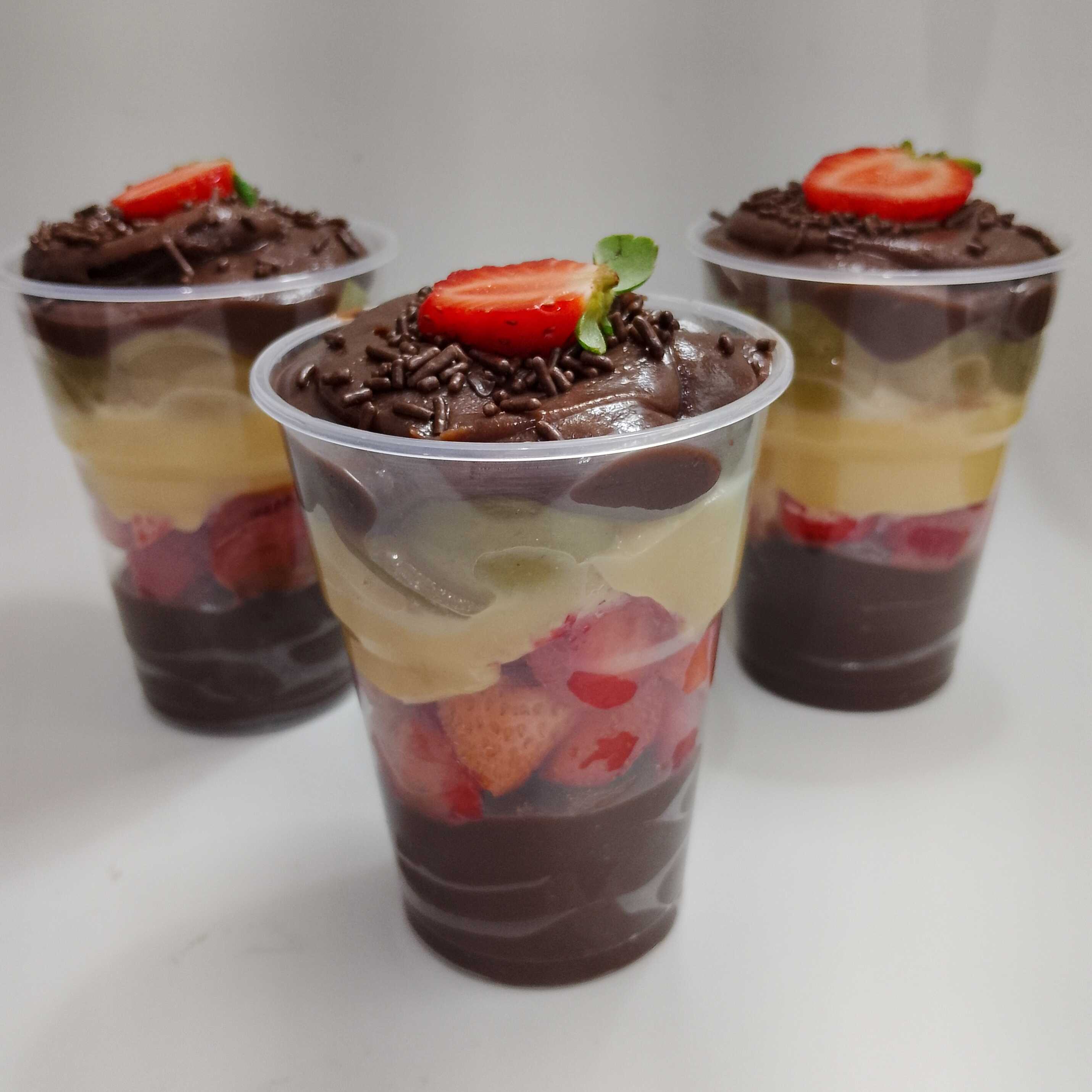 Brigadeiro tradicional, morango em pedaços, brigadeiro branco, uva, granulado