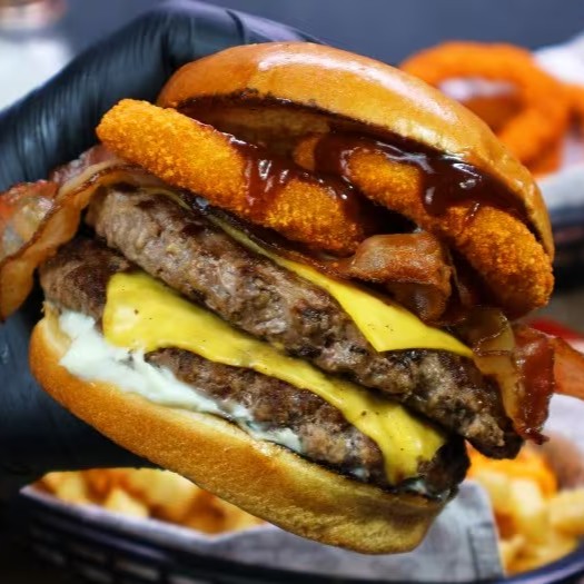 Pão, duas carnes artesanais de 100g, queijo cheddar, bacon, onion rings, barbecue e maionese.