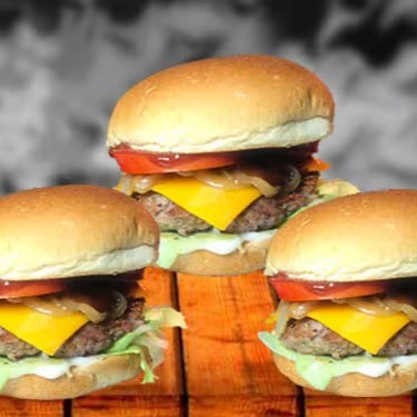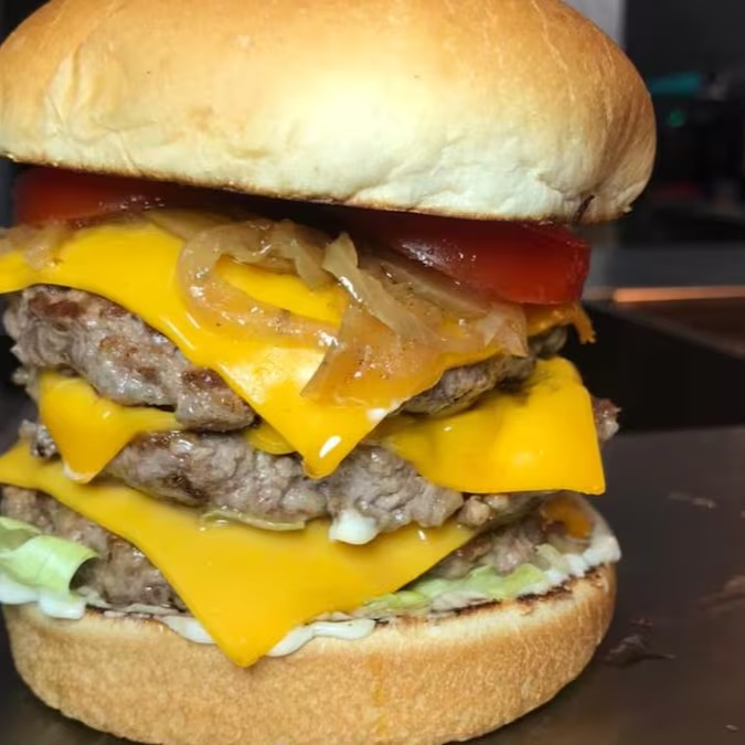 Delicioso Hambúrguer Artesanal. Pão Selado, 3 carnes Smash de 100g, Queijo Cheddar, Molho Barbecue, Maionese e Salada: ( Tomate, Cebola, Alface Americana).