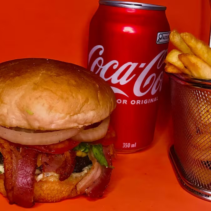 Hambúrguer artesanal com um suculento smash de 100g, com fatias crocantes de Bacon, coberto com queijo cheddar derretido em um pão selado à perfeição. Acompanha uma refrescante salada de tomate, cebola e alface americana. O toque especial fica por conta do molho barbecue e da maionese verde. Para completar, uma porção de 200g de batatas fritas crocantes e uma lata de Coca-Cola de 350ml, complementam essa experiência gastronômica inigualável.