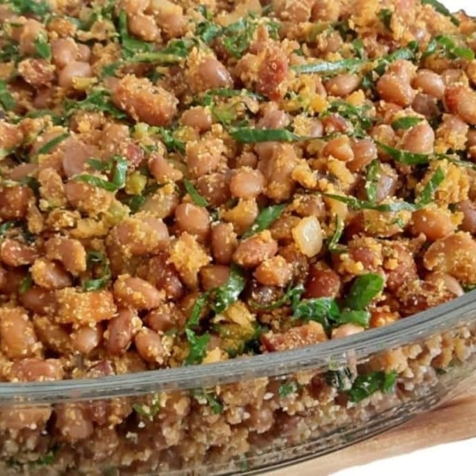 Quentinha completaa Feijão tropeiro, arroz, macarrão, salada maionese e vinagrete.