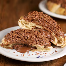 Delicioso Croissant de chocolate com muito recheio de chocolate e coberto com chocolate ao leite com granulado belga.
