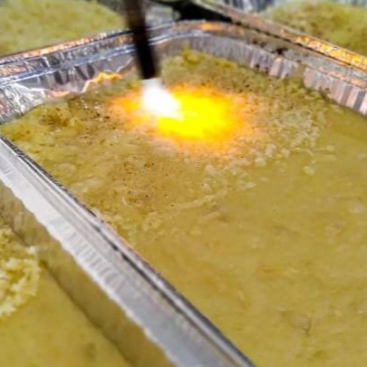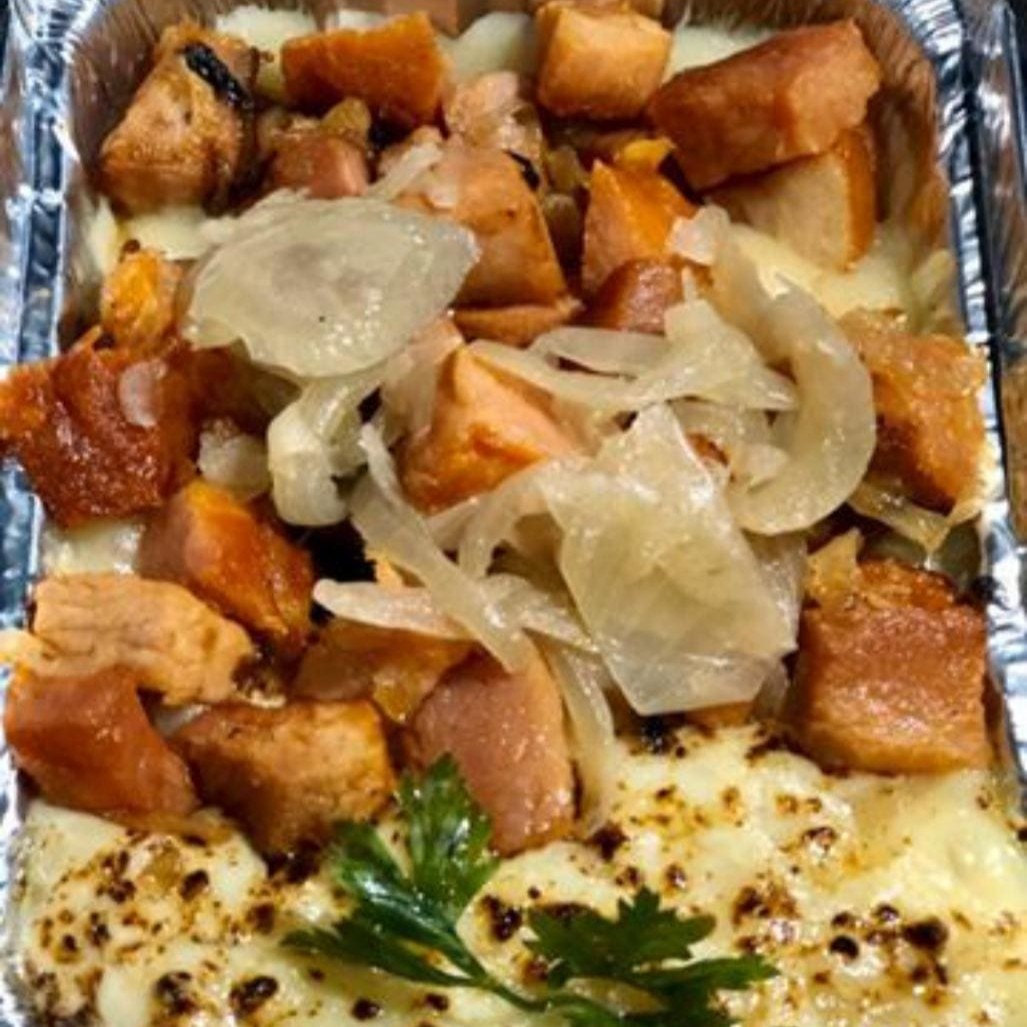 Pirão de aipim, queijo mussarela maçaricado e frango. Dois tamanhos: P com Aproximadamente 700 gramas ou G com Aproximadamente 1.400 gramas