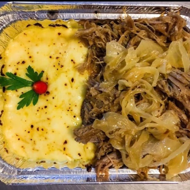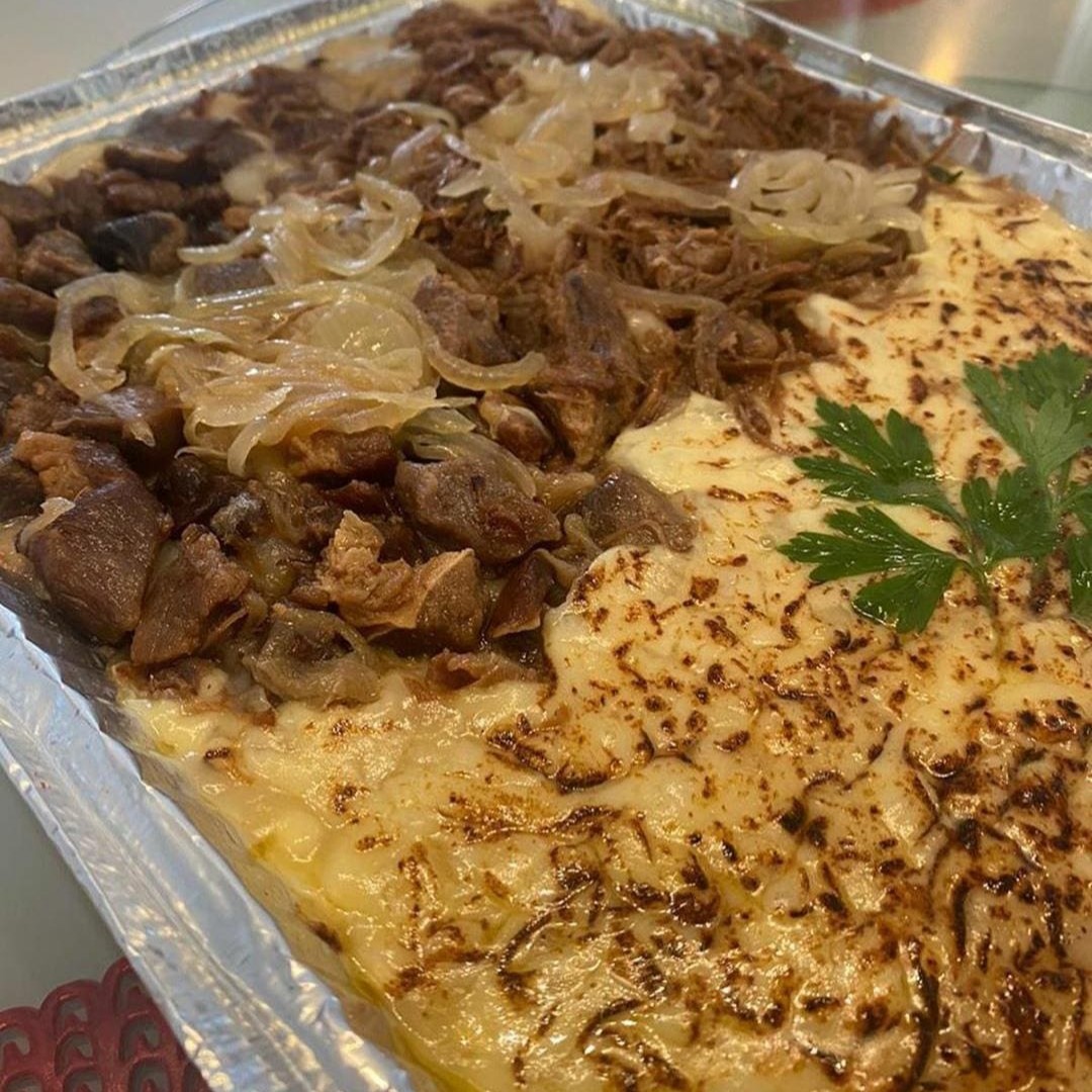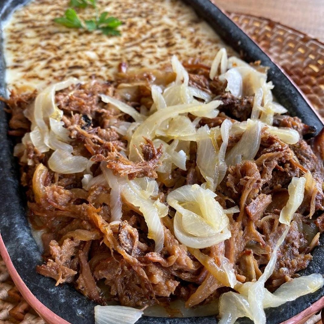 Pirão de aipim com aquele cupim desfiado todo suculento que derrete na boca e queijo maçaricado Dois tamanhos: P com Aproximadamente 700 gramas G com Aproximadamente 1.400 gramas