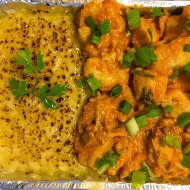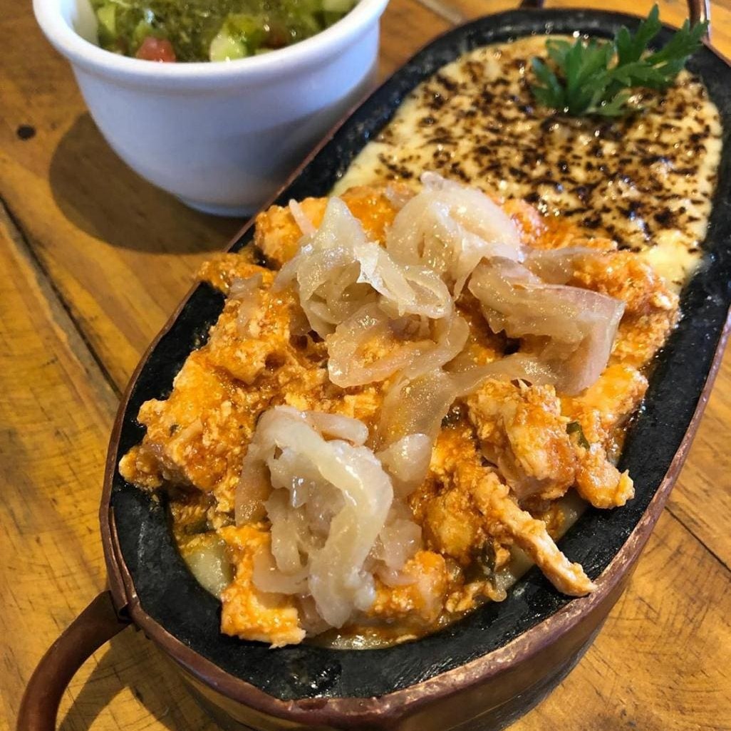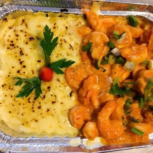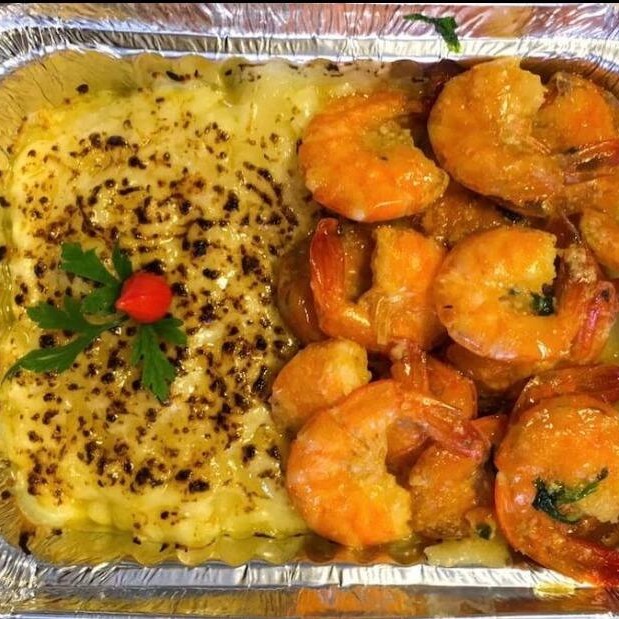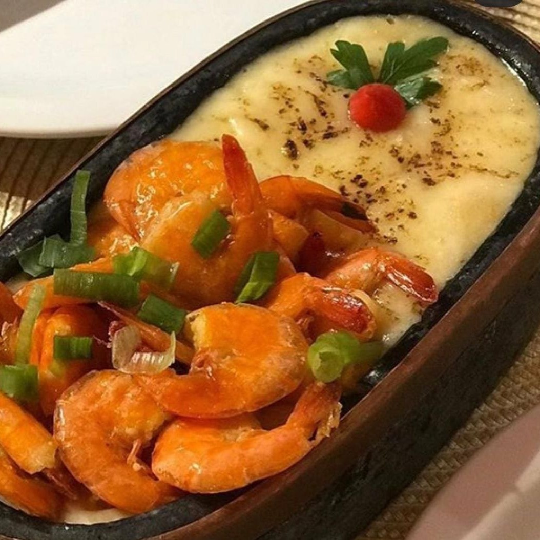 Pirão de aipim, queijo mussarela maçaricado e camarão ao alho e óleo. Dois Tamanhos: P com Aproximadamente 700 gramas ou G com Aproximadamente 1.400 gramas