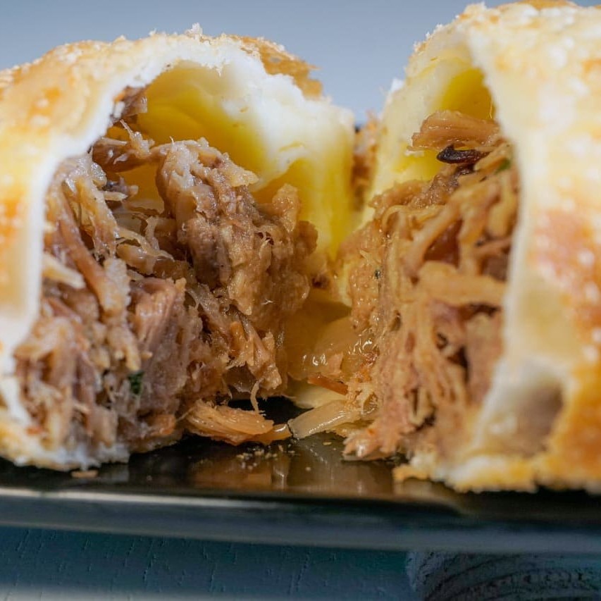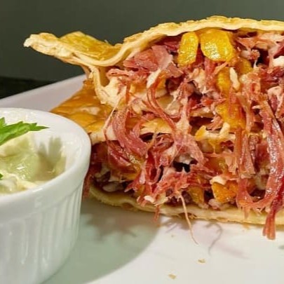 Um delicioso e generoso pastel recheado com cupim desfiado e queijo!