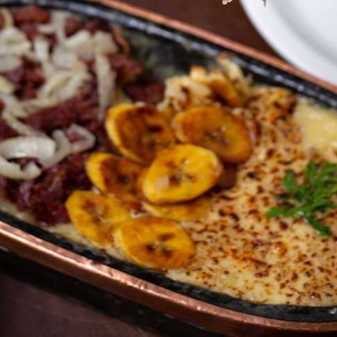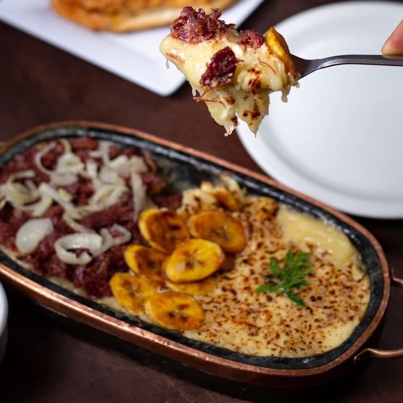 Pirão de aipim, carne seca, banana da terra e queijo maçaricado por cima