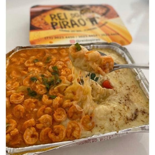 O poderoso camarão ao molho especial do Rei com pirão de aipim, queijo mussarela maçaricadinho. Dois tamanhos: P com Aproximadamente 700 gramas G com Aproximadamente 1.400 gramas