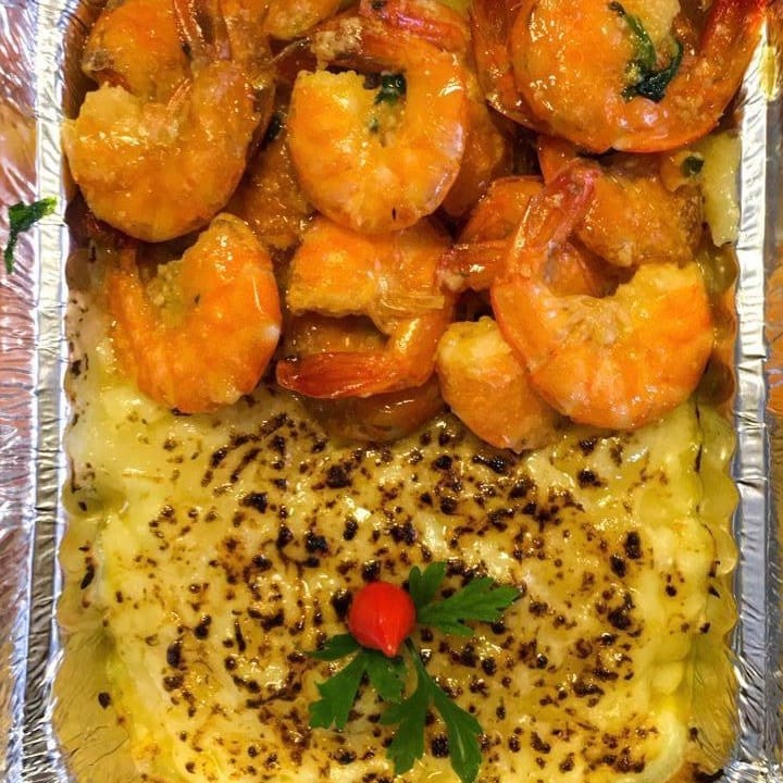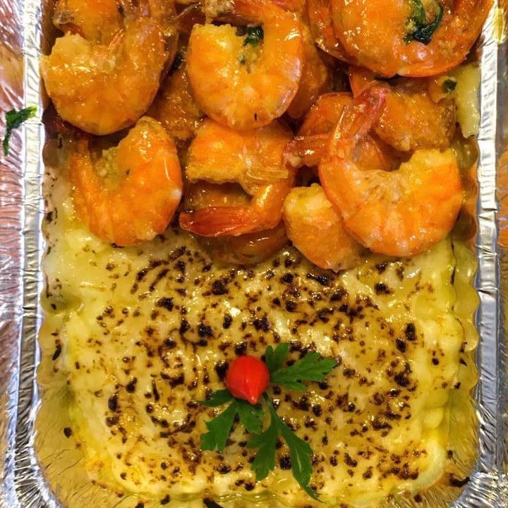 Prato executivo de Camarão ao Alho e Óleo - pirão de aipim com queijo maçaricado por cima, aproximadamente (400g total do prato) Almoço ou jantar .