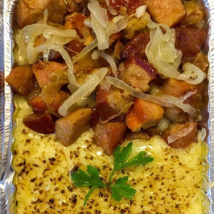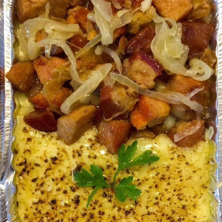 Prato executivo de Fumeiro, pirão de aipim com queijo maçaricado por cima, (400g total do prato) Almoço ou Jantar
