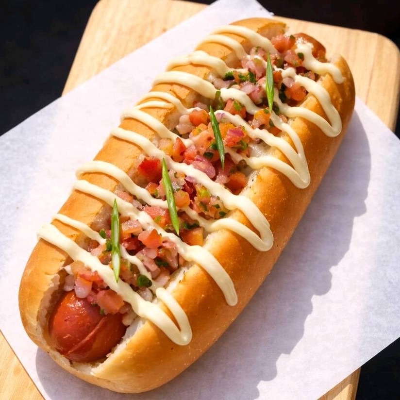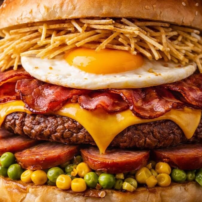 Pão, carne, Bacon, ovo, calabresa ,queijo, batata palha, milho e ervilha