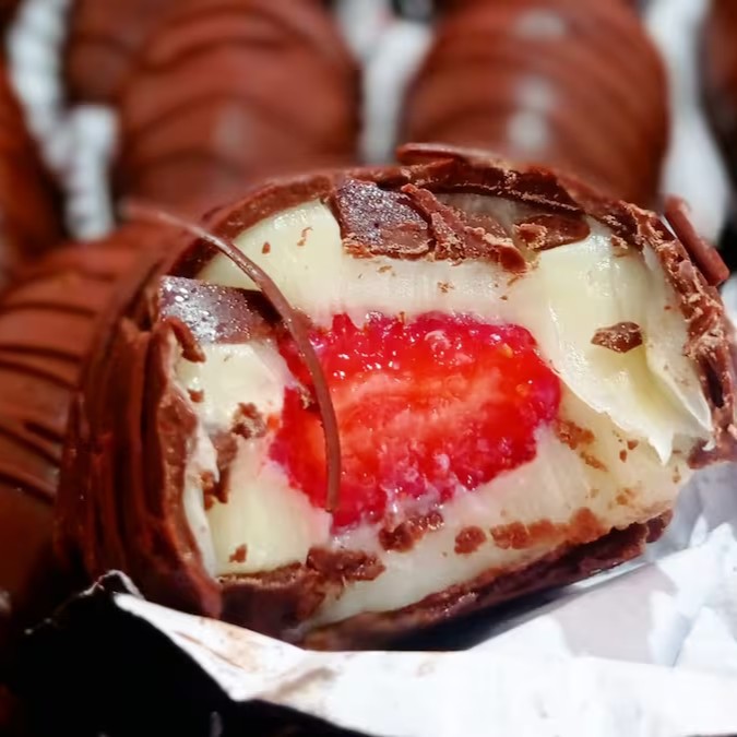 Morango encapado no brigadeiro de leite em pó e banhado no chocolate meio amargo.