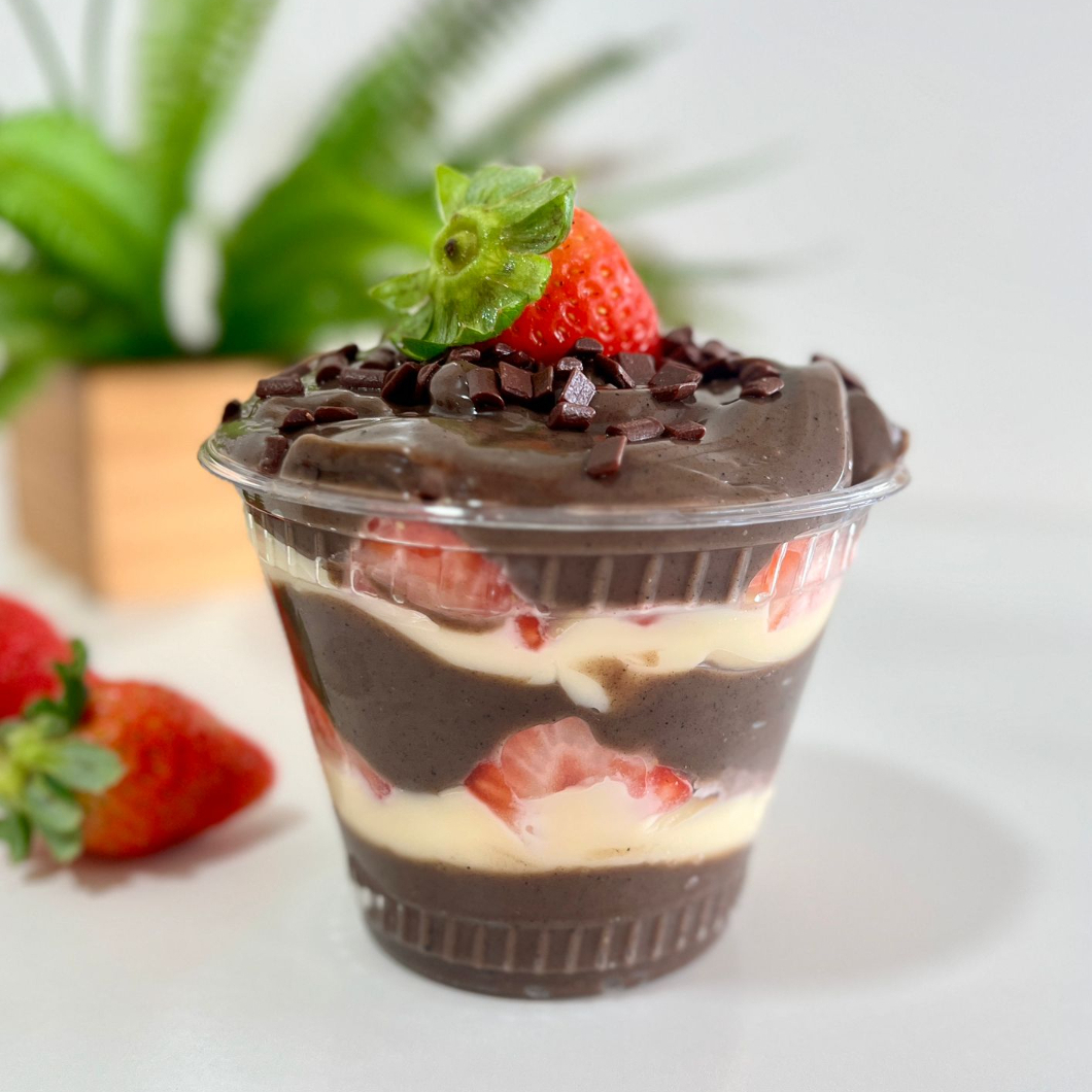 Copo 250ml, Morangos picados brigadeiro meio amargo, creme de ninho copo 250ml