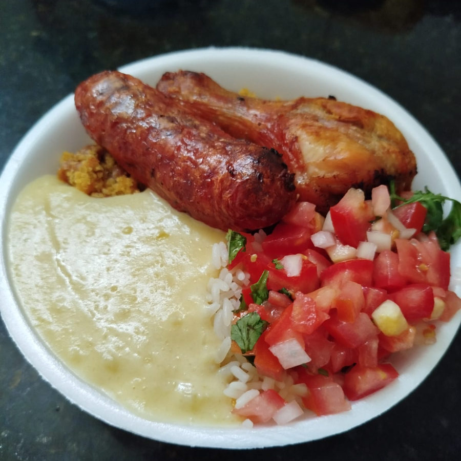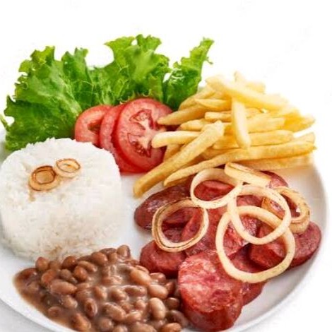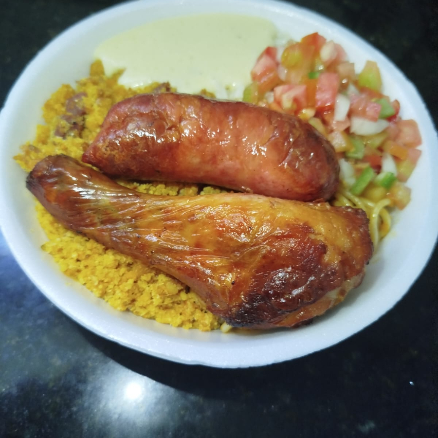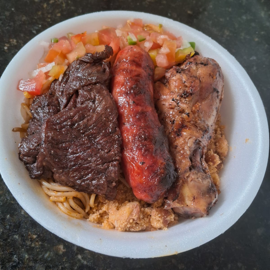 Acompanha: arroz, macarrão, escolha feijão tropeiro ou feijão de caldo e salada alface com tomate