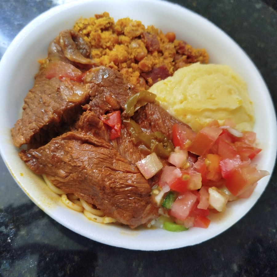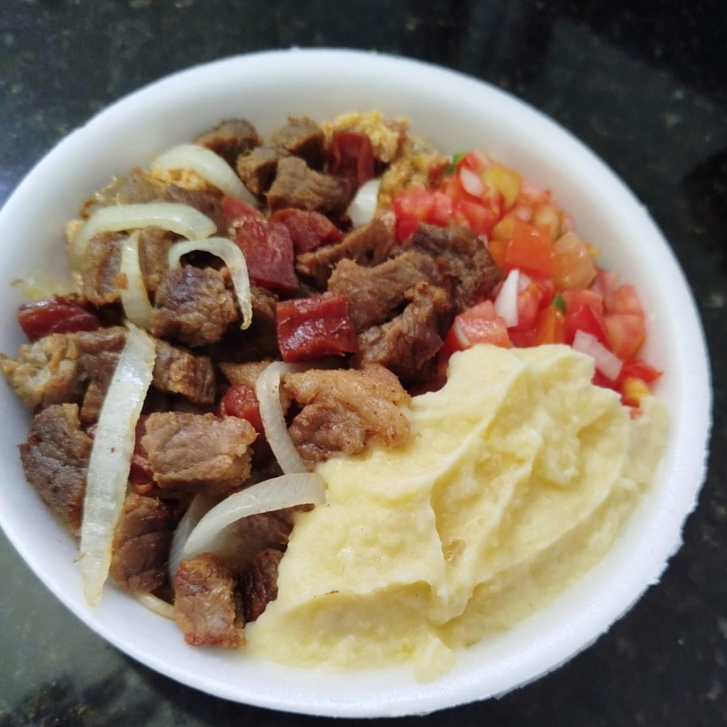 Acompanhamentos: arroz, macarrão, feijão tropeiro ou feijão de caldo, purê de batata e salada de vinagrete