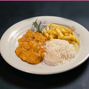Estrogonofe de camarão cremoso e bem temperado, preparado com camarões suculentos. Porção individual. Selecione 3 acompanhamentos para completar sua refeição.