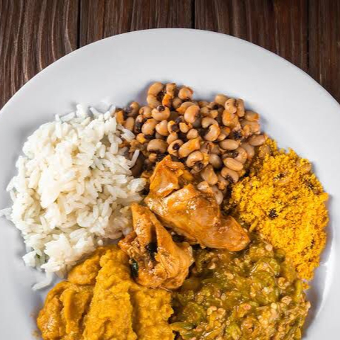Caruru, vatapá, feijão fradinho, arroz branco soltinho e farofa. Uma combinação tradicional da culinária baiana, bem temperada e cheia de sabor.