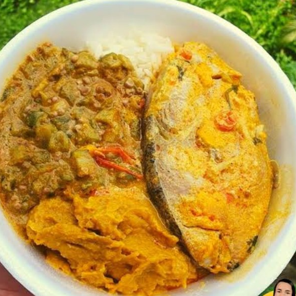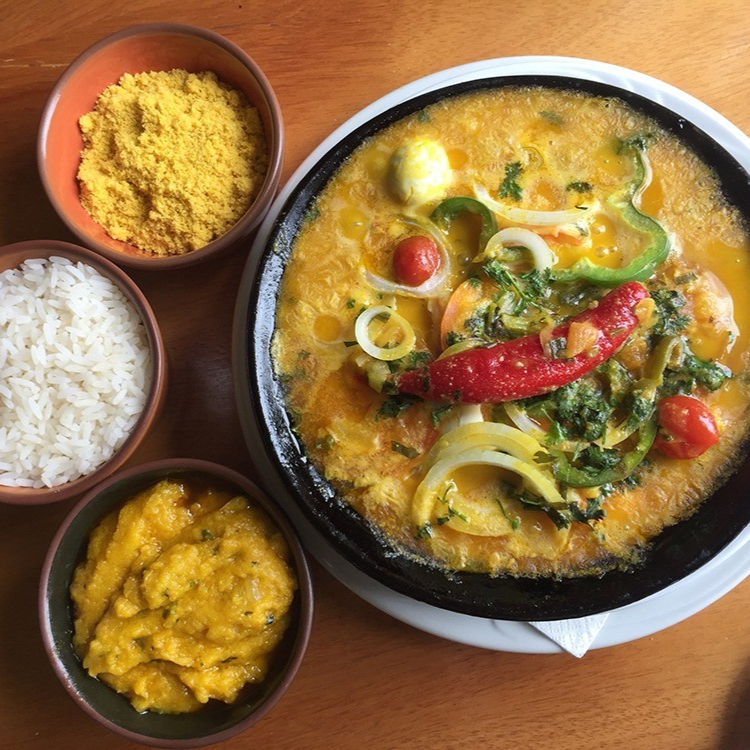 Vatapá, caruru, feijão fradinho, farofa de dendê e moqueca de camarão preparados no estilo tradicional baiano. Uma combinação rica em sabores e cheia de tradição da culinária da Bahia.