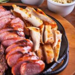 1 peça de carne, frango e linguiça toscana, acompanhadas de 3 acompanhamentos à sua escolha. Uma combinação completa e bem servida para sua refeição.