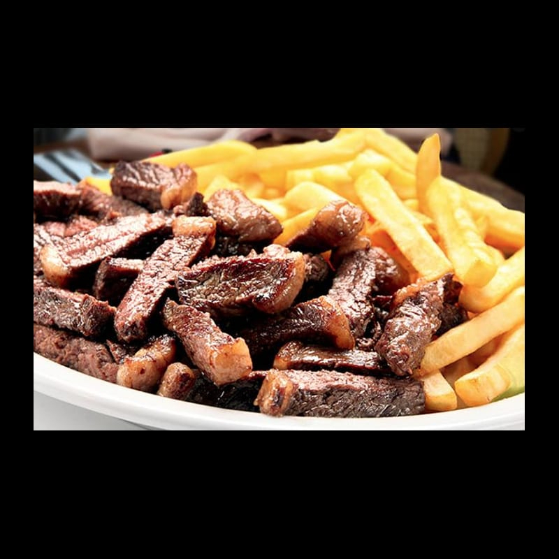 Carne de churrasco bem temperada e preparada no ponto certo, acompanhada de batata frita crocante. Uma marmita robusta, completa e cheia de sabor.