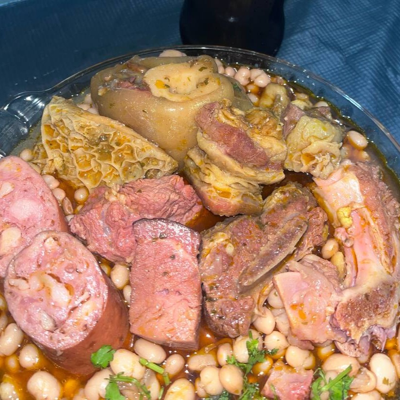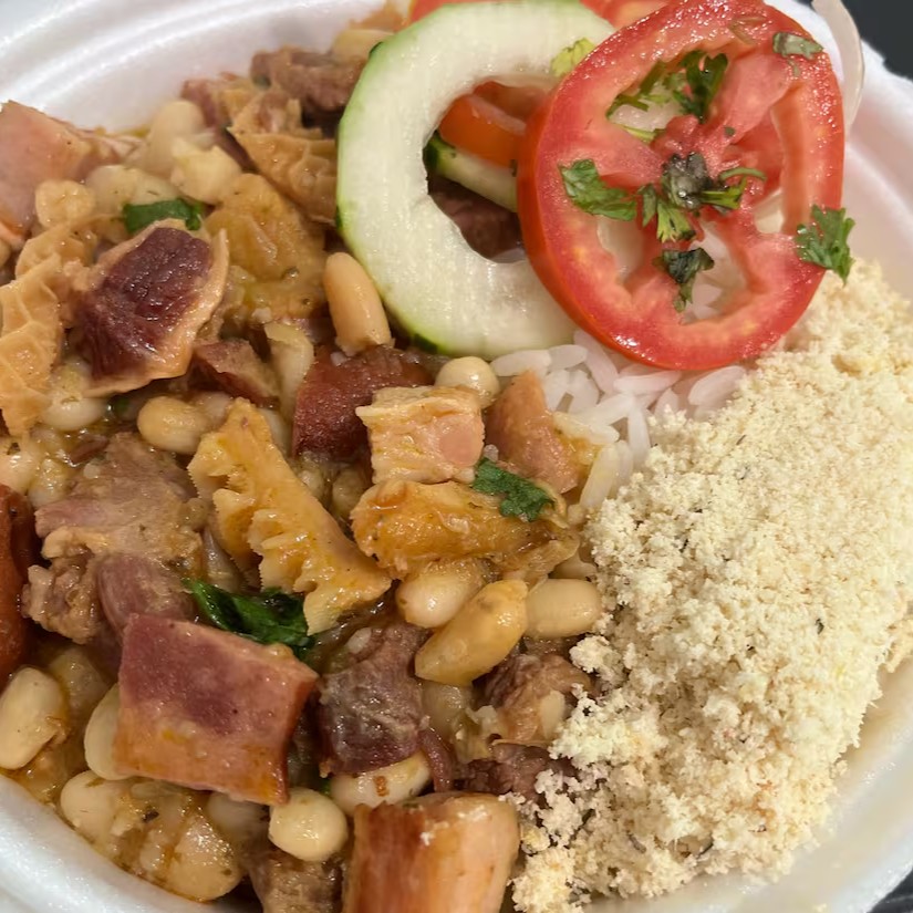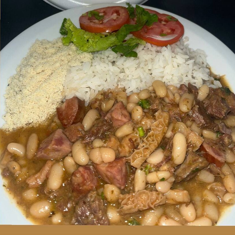 Feijoada completa com mocotó, fato, calabresa, carne de boi e charque. Acompanhando com arroz branco, salada e farofa.