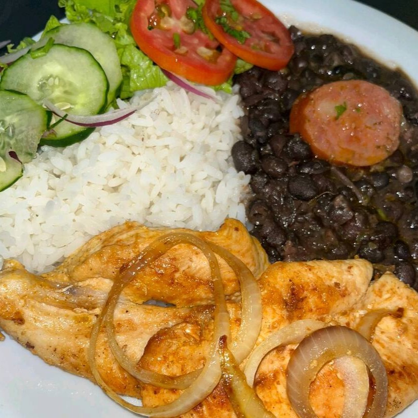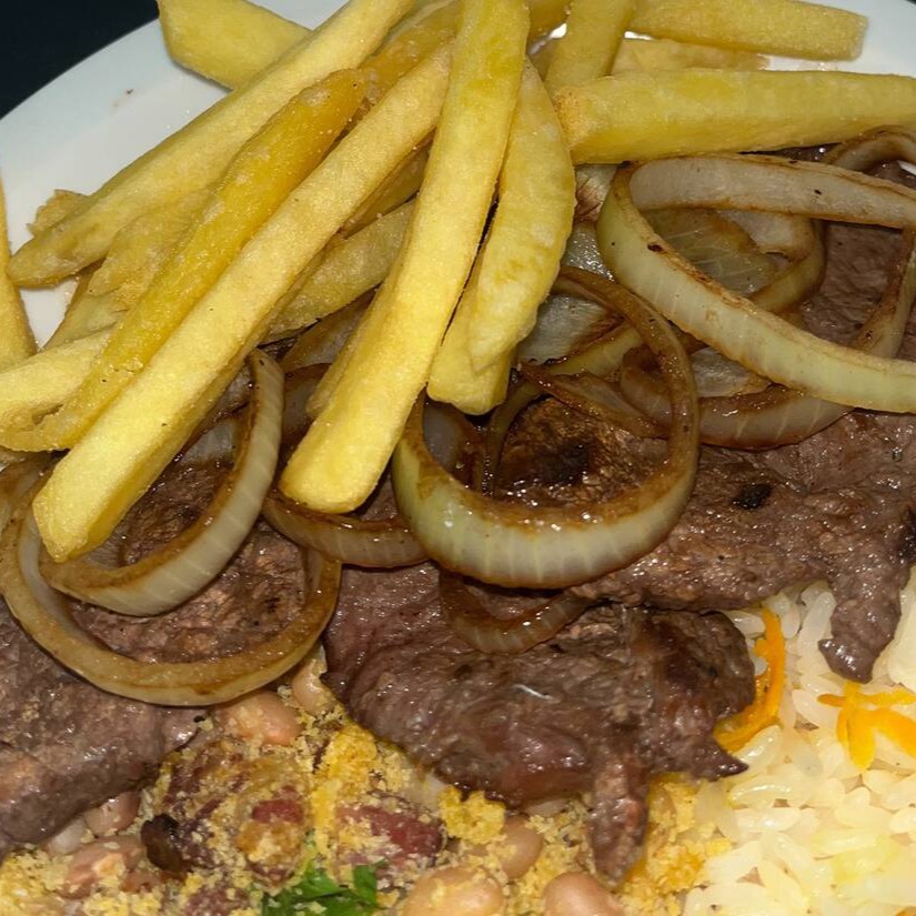 Acompanha arroz, feijão de caldo ou tropeiro, fritas e salada.