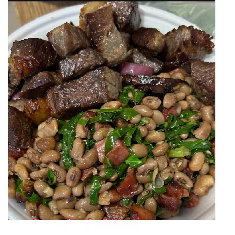 Picadinho de carne do sol,toscana,feijão fradinho, farofa e salada