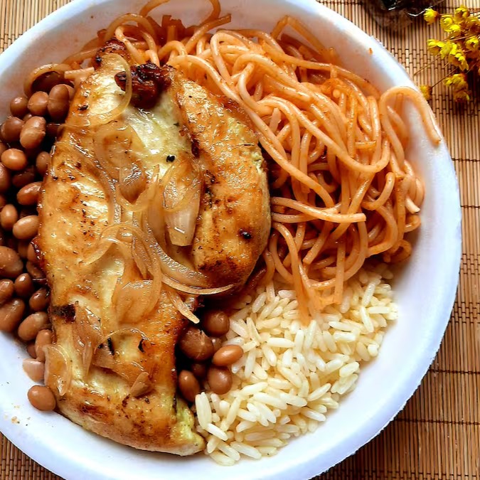 Arroz, Feijão de Caldo, Feijão Tropeiro, Macarrão e Salada.