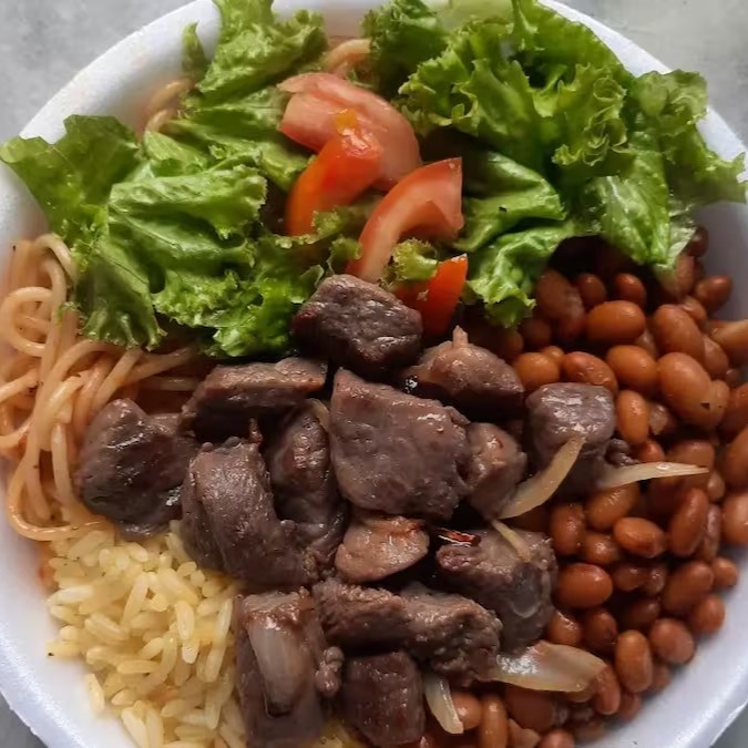 Escolha 3 acompanhamentos: Arroz, Feijão de Caldo, Macarrão, Farofa Crocante e Salada Crua