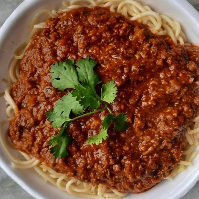 Macarrão Espaguete refogado no alho e óleo, coberto com molho bolonhesa a base de molho de tomate, carne moída e especiarias.