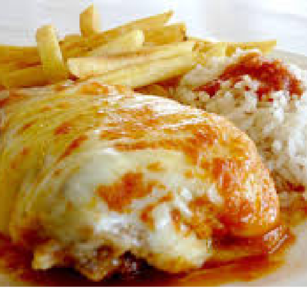 Filé de Frango, bem temperado e suculento feitos à milanesa, cobertos por uma camada de queijo e banhados por molho de tomate e uma pitada de orégano para finalizar.