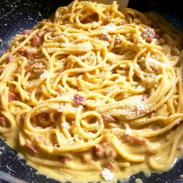 Delicioso Spaghetti carbonara com creme de Leite e Bacon e queijo parmesão