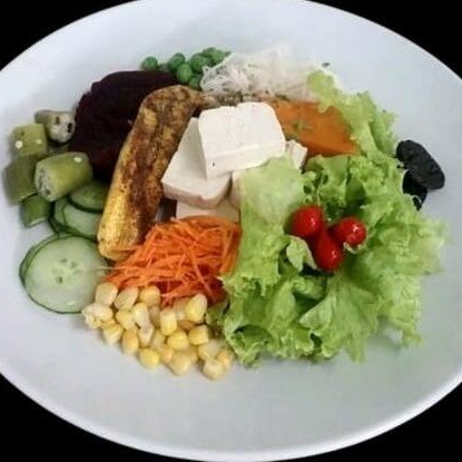 Feijão verde, arroz integral,farofa de soja, salsicha vegetal + salada orgânica.