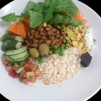 Arroz integral ,feijão verde,farofa molhada e saladas.