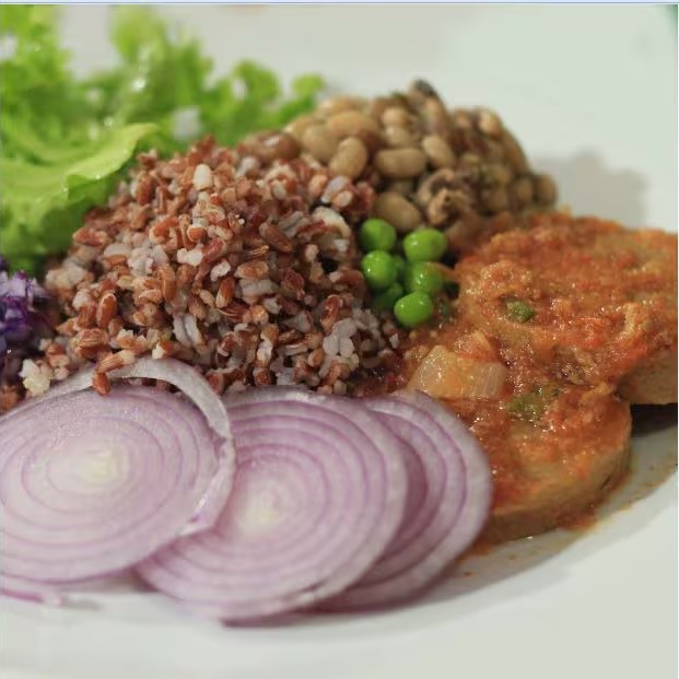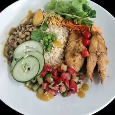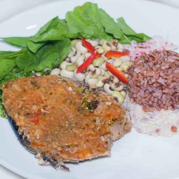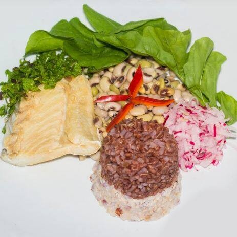 Feijão verde, arroz integral,farofa de soja, peixe ensopado + salada orgânica.